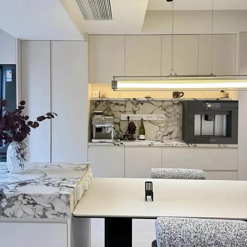Arabescato marmeren werkbladen en omgeving bieden woonruimtes een tijdloze, klassieke elegantie.