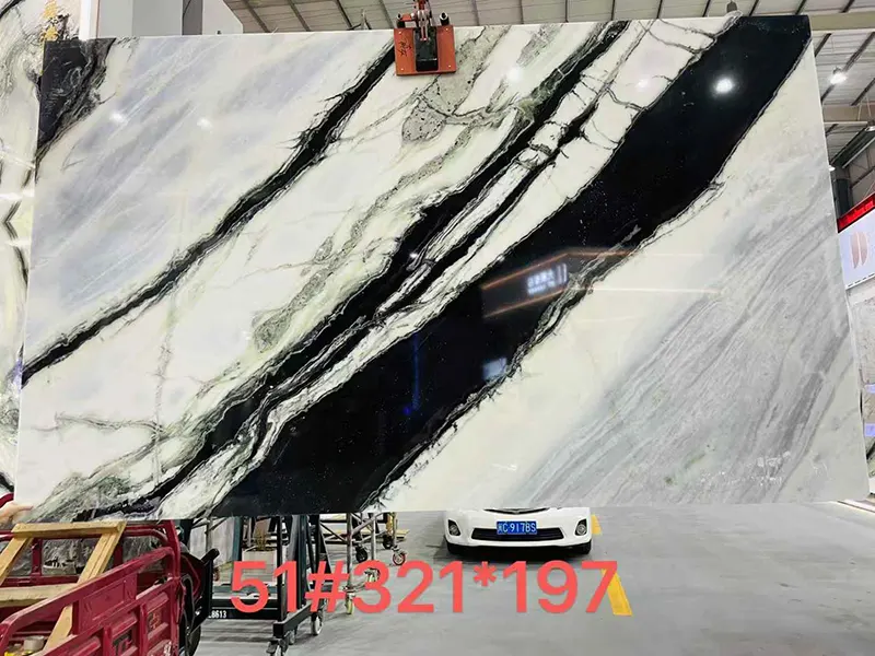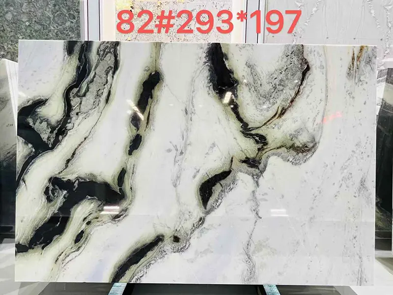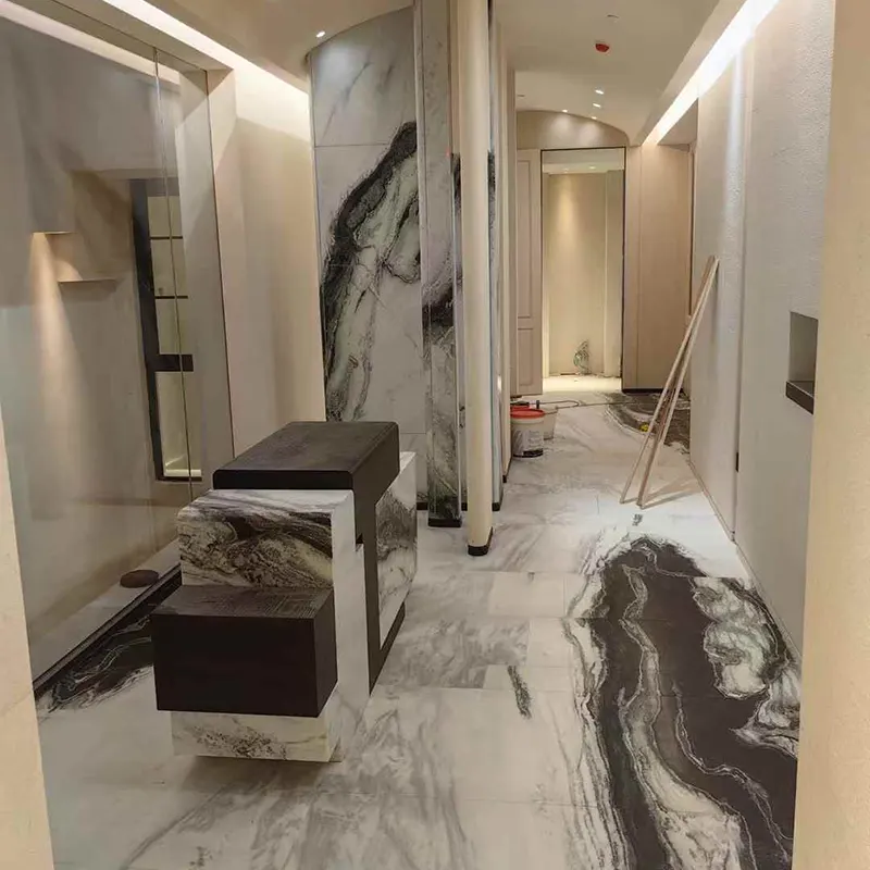 Elke Panda-marmeren plaat heeft een uniek patroon van vloeiende zwarte "panda-achtige" strepen op een witte basis, verwant aan een stenen canvas. De artistieke flair wordt verder benadrukt bij het gebruik van Panda Marble BookMatch -technieken in speelwanden of backsplashes.