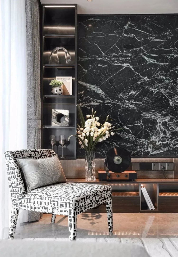 Een kamer wordt onmiddellijk dramatischer en eleganter gemaakt door het gebruik van zwart marmer. Het ziet er geweldig uit op vloeren, deurframes of accentstukken met een donkere achtergronden en opvallende aderen. Gebruik het gewoon spaarzaam omdat te veel zwart af en toe een kamer een koud of zwaar gevoel kan geven.