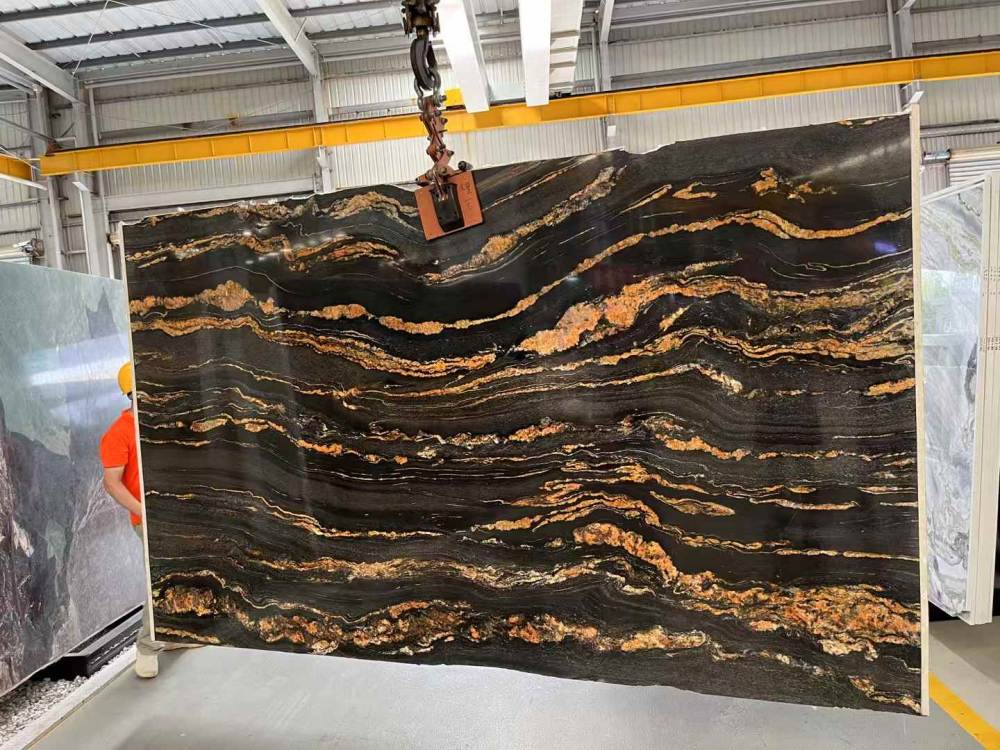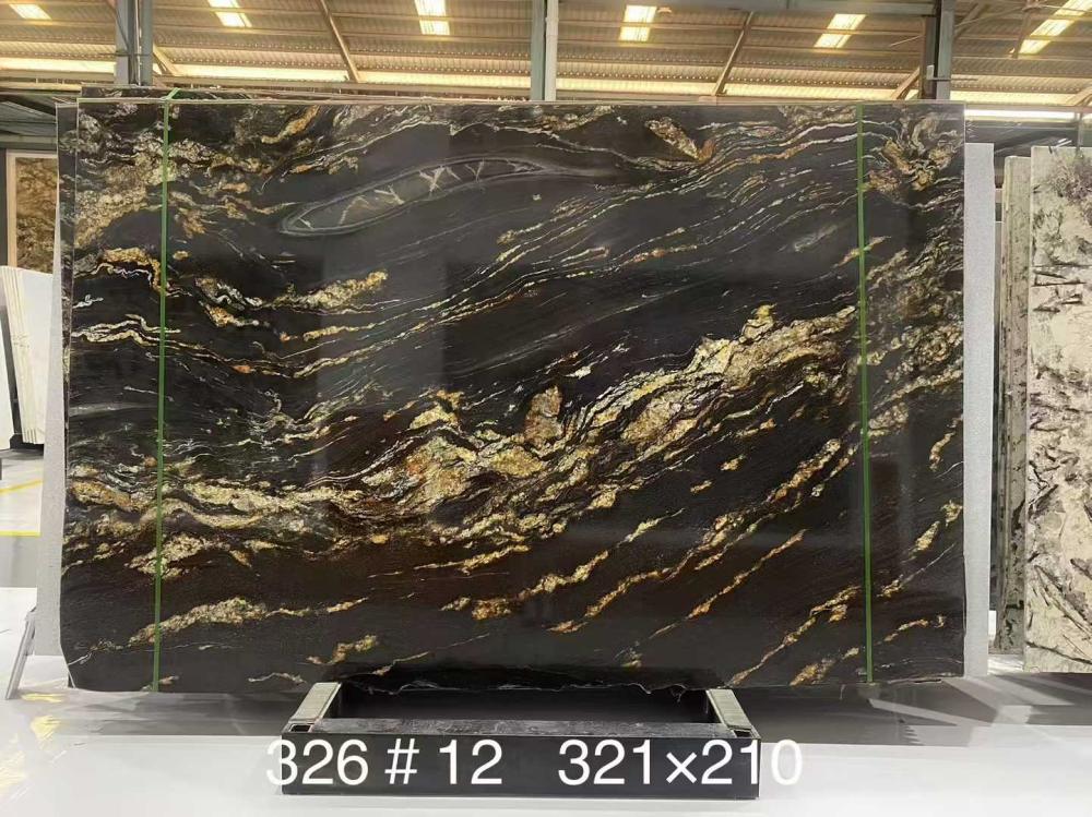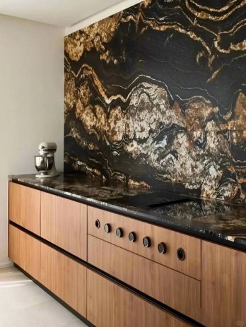 Met gouden draden die door een diepe obsidiaanbasis lopen, is Magma Gold Granite een zwarte luxe steen uit Brazilië. In de volksmond bekend als de Galaxy Stone, vertoont het een gelijkenis met een sterrenhemelhemel. Het is een perfecte keuze voor luxe stenen werkbladen en backsplashes vanwege het hoge contrast tussen de gouden aderen en de zwarte achtergrond. Populair bekend als de Galaxy Stone, vertelt het een gelijkenis met een sterrenhemelhemel. Het is een perfecte keuze voor luxe stenen werkbladen en backsplashes vanwege het hoge contrast tussen de gouden aderen en de zwarte achtergrond.