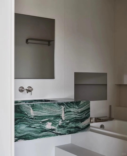Green Lapponia kwartsietis vooral merkbaar in keukens en badkamers van moderne luxe huizen. Probeer het met matte witte wastafels of geborstelde gouden kranen om zijn briljante karakter te accentueren. Gebruik het in een gewaagde Braziliaanse kwartsiettabel of kwartsiet open haard als het brandpunt.