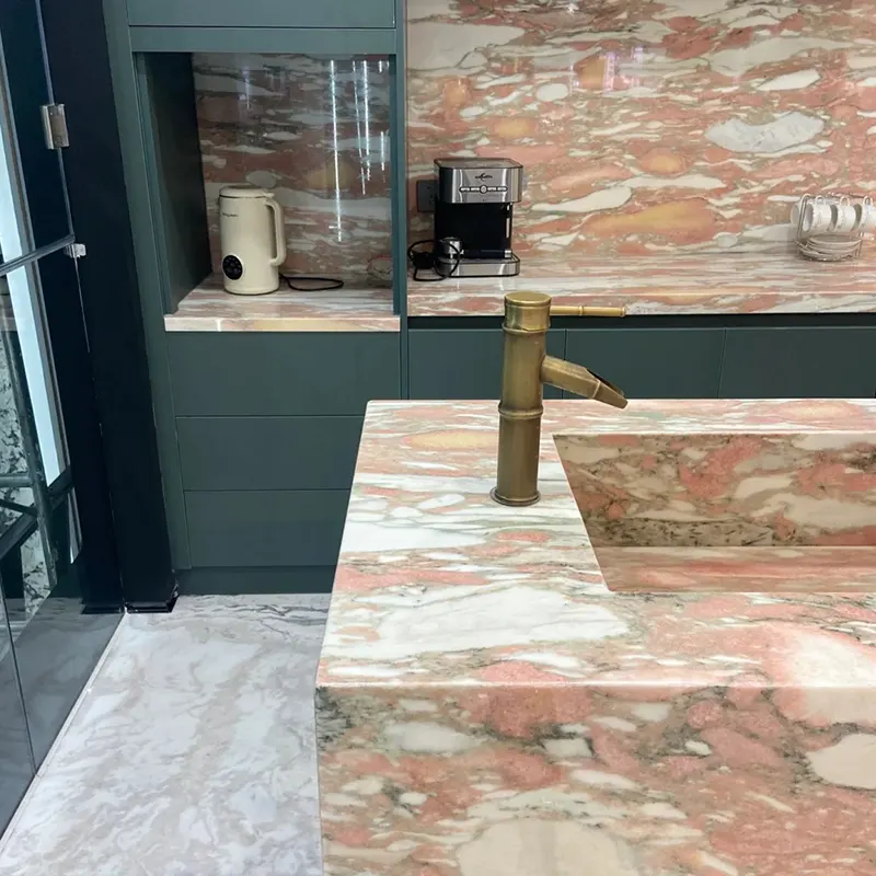 Roze marmeren accenten en roze marmeren keuken backsplashes worden steeds populairder in landen als Frankrijk en Italië. Ze combineren old-world glamour met moderne chic.