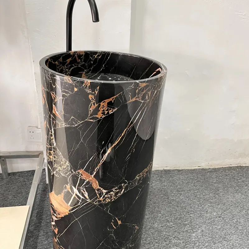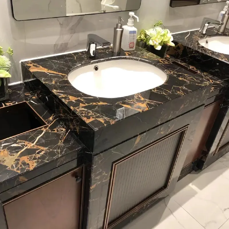 Als je een high-end spa-look wilt, is Portoro Gold Marble een geweldige keuze. Ontwerpers gebruiken het vaak voor zwarte marmeren badkamer ijdelheden, zwarte marmeren badkameraccessoires of hele zwarte marmeren bekledingen. Het goud en het zwart samen vormen een rustige maar luxueuze ruimte.