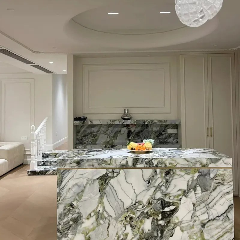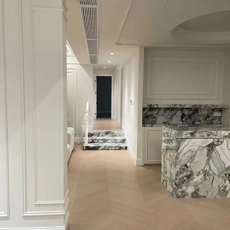 Aangepaste projecten: de steen kan worden gevormd in gootsteenomgeving, ijdelheid tops, eilandbanen en groene marmeren mozaïekvloeren. De veelzijdige maat- en afwerkingskeuzes helpen het om zowel klassieke als moderne ontwerpen te passen.