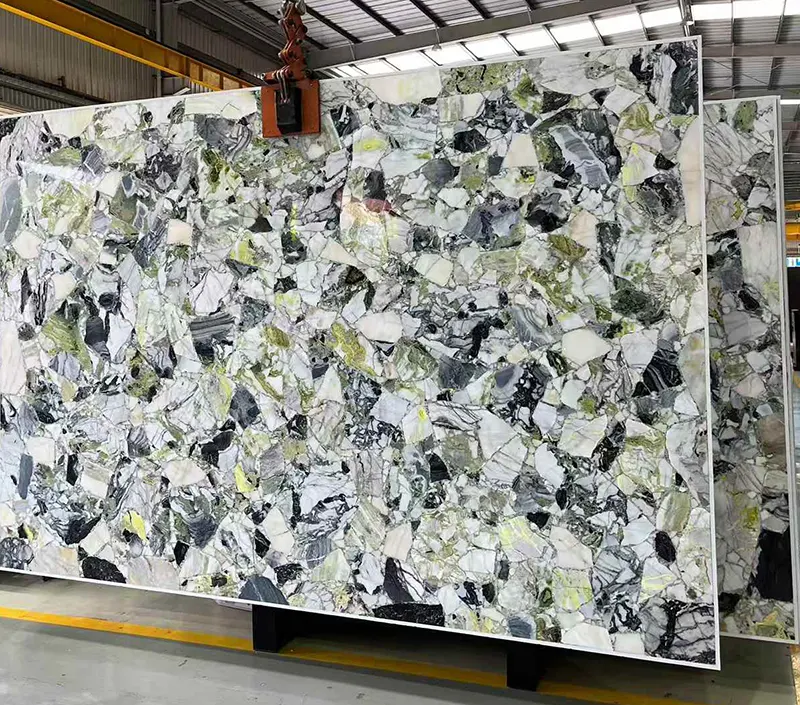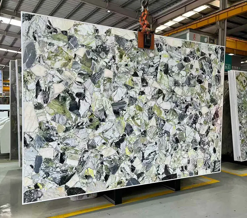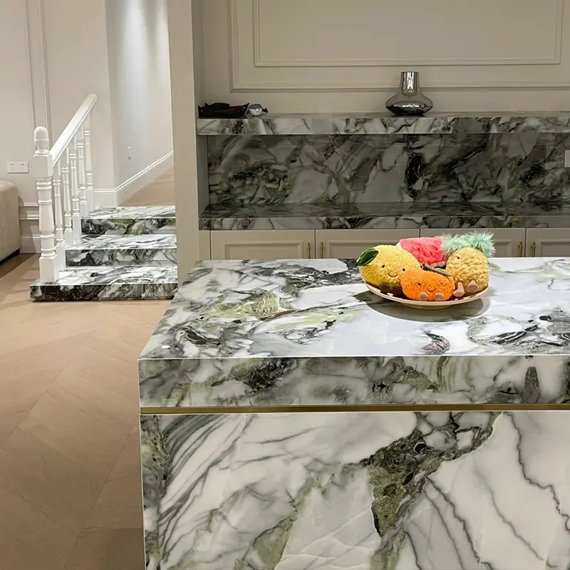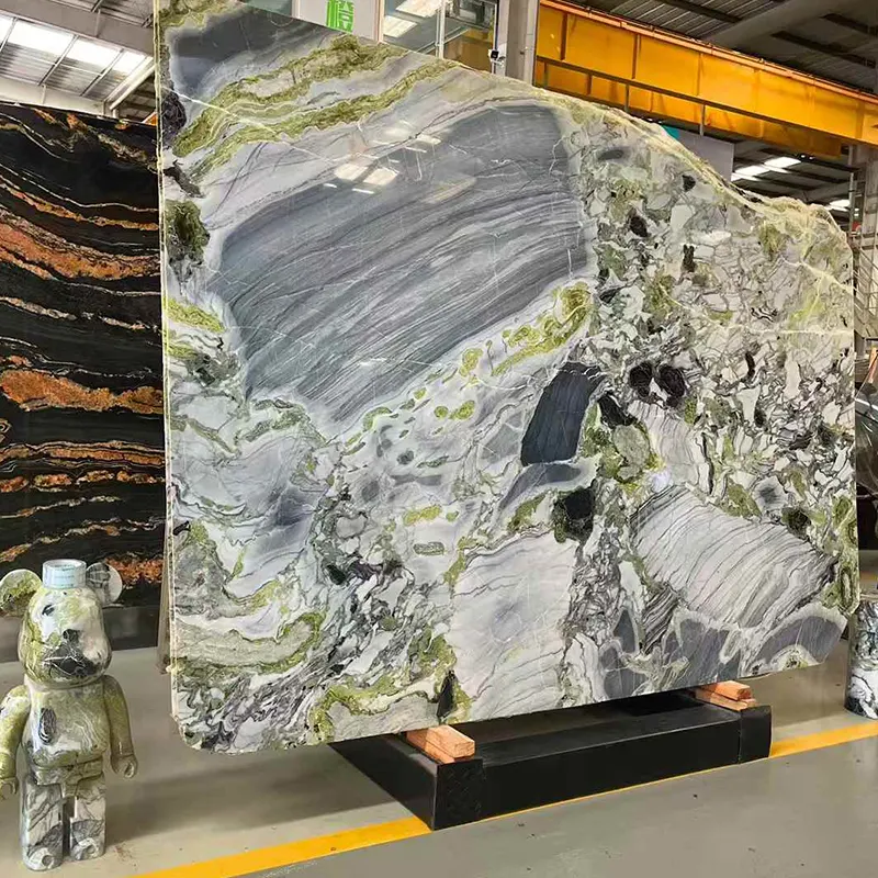 Sterk contrast Veining en bijna fluorescerende groene kleur van Primavera Marble -plaat definiëren het. De levendige kleuren geven het leven van binnenomgevingen en vergroten hun energie en vitaliteit. Hoewel de gedetailleerde patronen elke plaat uniek maken, biedt de groene marmeren achtergrond een sterke visuele aanwezigheid zonder overweldigend effect.