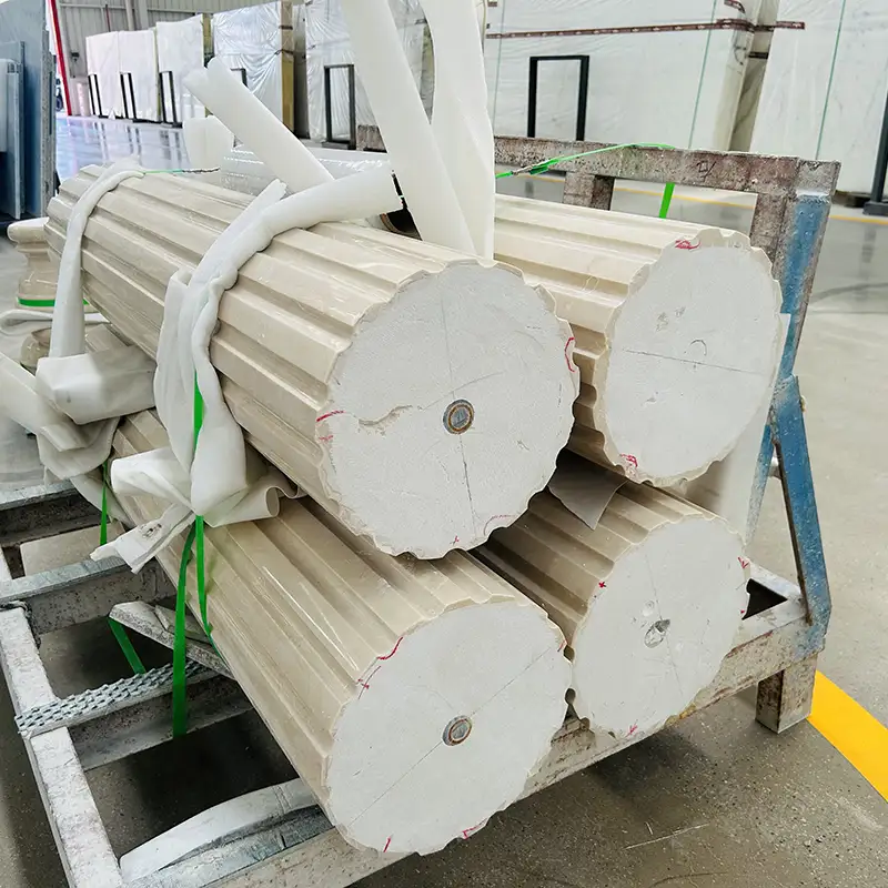 Het snijden van goede marmeren kolommen uit een enkel blok steen is de tweede techniek. Ze zijn duurder en zwaarder, maar hebben een ongeëvenaarde structurele sterkte en visuele impact. Het zijn allemaal gestroomlijnde meesterwerken die luxe en professionaliteit schreeuwen en ideaal zijn voor vijfsterrenhotels, musea, galerijen en hoogwaardige villa's.