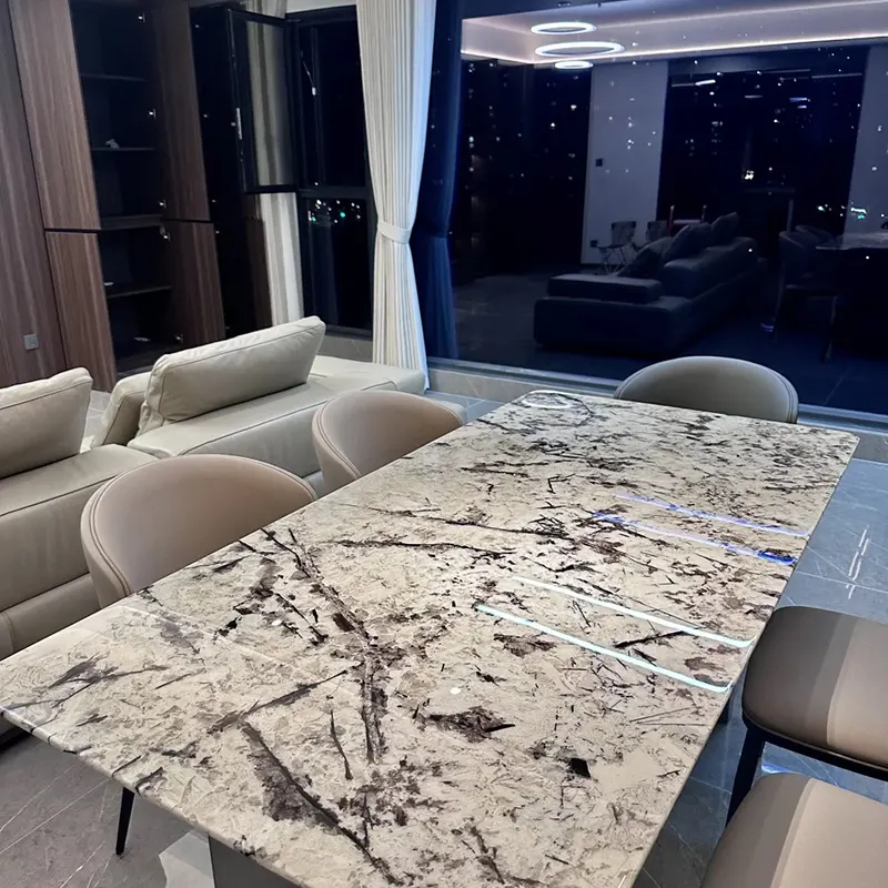 Meubels zoals dineren of salontafels profiteren van zowel vorm als functie van Silver Fox Granite.