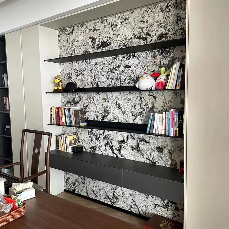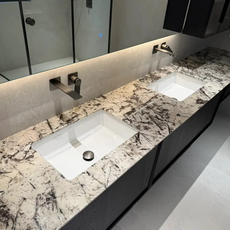 Materialen waaronder mat zwart metaal, geborstelde gouden armaturen en zachte houten tinten gaan bijzonder goed met zilveren vossen graniet. Wat betreft aanvullende stenen selecties, zou het combineren met beige marmer of zwart graniet een mooi contrast produceren. Dit vergemakkelijkt het creëren van consistente gebieden die zowel moderne als klassieke voorkeuren weerspiegelen.