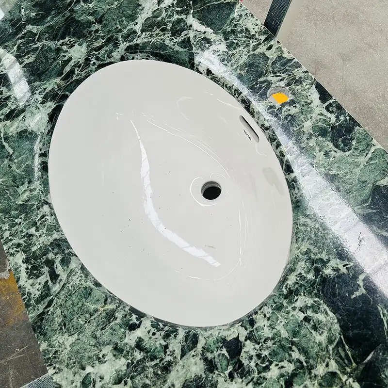 De Verde Rameggiato marmer ijdelheid top is meer dan een aanrecht; Het importeert schoonheid, vrede en verfijning die nooit uit de mode zal gaan in uw dagelijkse routine. Dit product introduceert iets speciaals in elke kamer, of u nu een rustige retraite in uw huis bouwt of een luxe hotelbadkamer verbouwt.